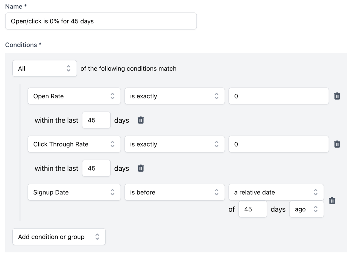 I use beehiiv for my newsletter. A really helpful audience segment to build to determine who on your list is unengaged in this one below.