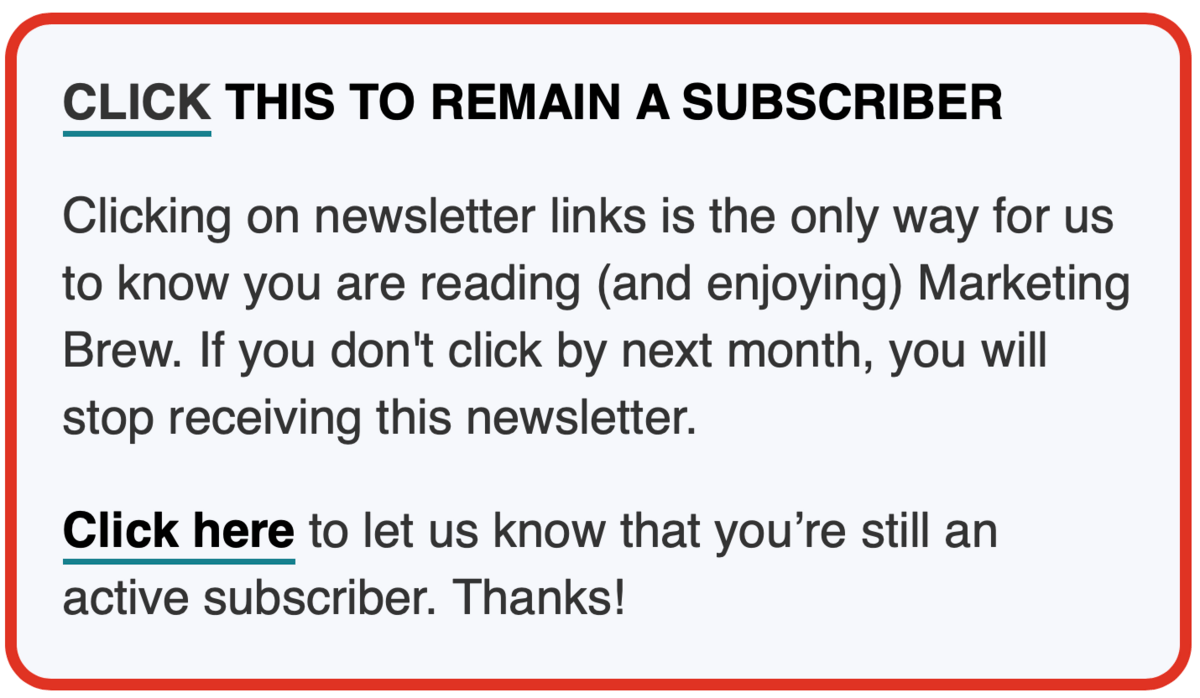 This example is an effective method to ask for engagement and communicate directly to your subscribers about your upcoming list cleaning. By using a combination of people who click the link (highly engaged) and those who open the email but possibly click some different link, you can segment your audience into buckets.