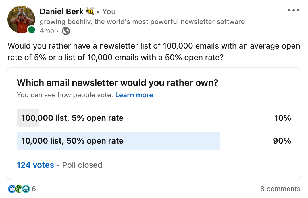 One person’s comment on this LinkedIn poll was thought provoking, and I wanted to get your opinion on it. They voted that they’d rather have the former: “100,000 list, 5% open rate” and left the following comment: